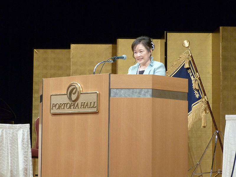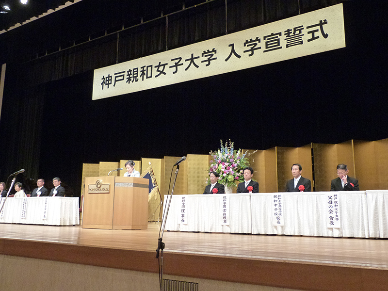 新入生の皆様ご入学おめでとうございます。本日ここに、通学部417名、編入学7名、大学院15名、通信教育部 93名(編入生を含む)の皆さんをお迎えすることが出来ました。神戸親和女子大学の教職員を代表いたしまして、新入生の皆さんのご入学を心より歓迎いたします。