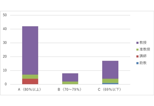 総合得点の80%以上を取得した者を「A」、70~79%までを「B」、69%以下を「C」としています。