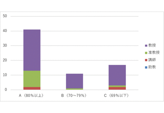 総合得点の80%以上を取得した者を「A」、70~79%までを「B」、69%以下を「C」としています。