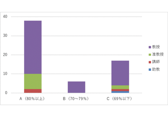 総合得点の80%以上を取得した者を「A」、70~79%までを「B」、69%以下を「C」としています。