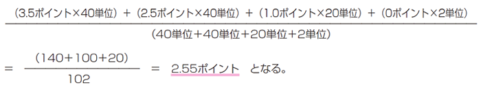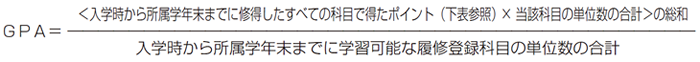 本学通信教育部では、正科生・課程正科生(除く科目等履修生)を対象に、GPA(グレード・ポイント・アベレージ)制度を導入しています。GPAは、すべての履修登録科目の成績の平均値を数値で表したもので、計算方法は下記のとおりです。