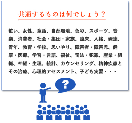 - 仕事や家庭、教育、臨床など、日常のさまざまな活動場面における人の心理を学ぶ