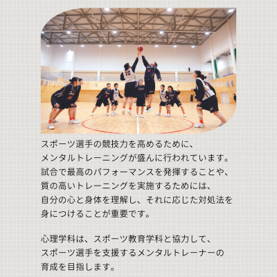 近年、スポーツ選手の競技力向上を目的としたメンタルトレーニングが盛んにおこなわれています。試合で最大限のパフォーマンスを発揮する、質の高いトレーニングを行うためには、自身のこころと身体を理解して、それにあわせた対処方法を身に着けることが必要です。 心理学科では、スポーツ教育学科と共同してスポーツ選手を支えるメンタルトレーナーの養成を目指します。
