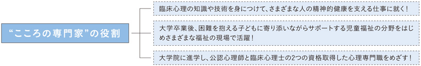 心理臨床の基礎知識から心理療法まで幅広く学び、心理学の知識をもとに人々の幸せや健康を支援する力を身に着けることを目的とします。そして、心理臨床の知識を持って児童福祉などの様々な福祉の現場で活躍する人材や、大学院と連携しながら6年一貫での教育体制をとり、公認心理師と臨床心理士の2つの資格を取得した心理専門職の養成を目指します。