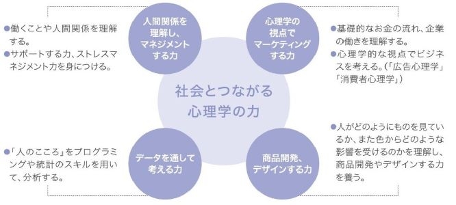 心理の学びがどのように社会とつながるのかを体験的、具体的に理解すること、そして、心理学の知見をもとに、マーケティングや組織を円滑にする人間関係の構築に貢献できる力、自身の感情やストレスをコントロールする力を身に付けた人材を育成することを目指します。