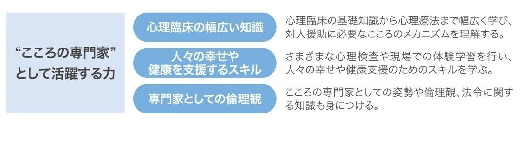 現代社会におけるさまざまなこころの問題を抱える人々に心理臨床の幅広い知識や高い倫理観をもって寄り添えるこころの専門家を育成します。また現場での学びを通して、一人ひとりのこころを支援する実践的なスキルも身につけます。