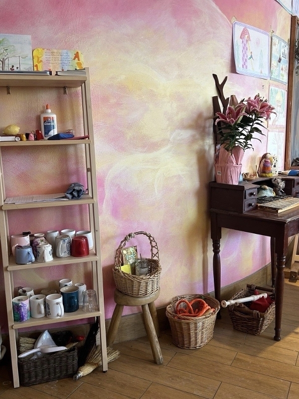 幼児クラスでは、各部屋にキッチンが備え付けられており、家具やおもちゃには木の素材が多く使用されていました。先生が指示を出すのではなく、歌を歌いながら活動を移行していく様子が印象的で、子どもたちは歌に合わせて自然と行動していました。先生が過度に介入せず、子どもが夢中になっていることを尊重する姿勢が感じられました。