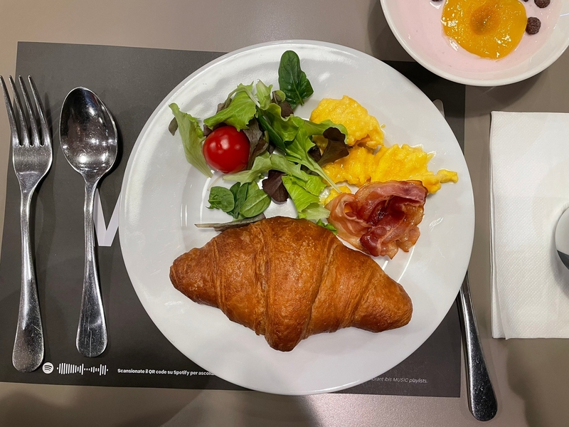 今日は、ミラノに来て初めての朝です。朝食はビュッフェスタイルで、美味しいものがたくさんあり、朝からお腹いっぱいで幸せでした。