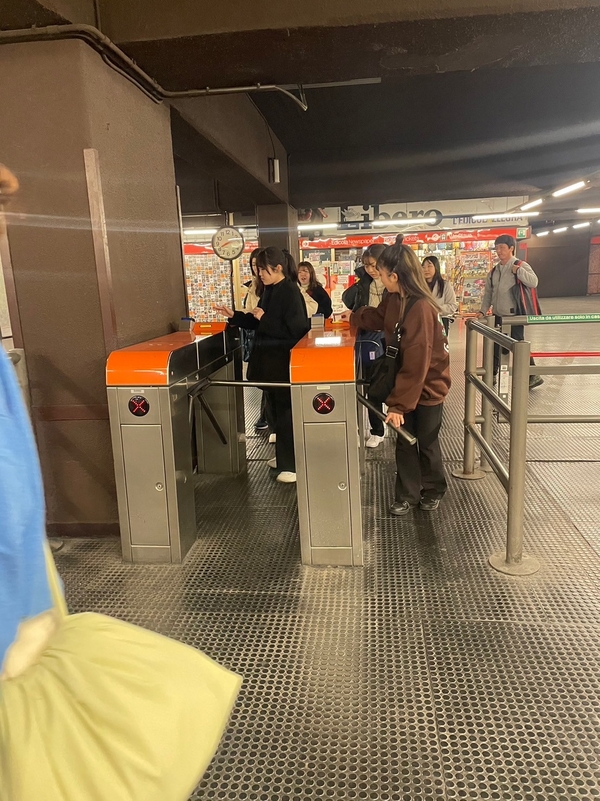 移動で地下鉄を利用しました。満員電車の中でLotto駅へ向かいました。そこから、学校までバスの予定でしたが、ストライキのためバスが来ず、歩いて向かいました。その途中に、「世界一長いベンチ」があることが判明し、時間があったため皆で写真を撮りました。