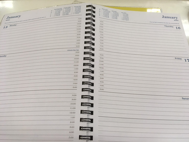 シドニー市内で販売されている手帳の一つを手にしましたが、スケジュールは朝8時から夕方6時までしか記入できません。