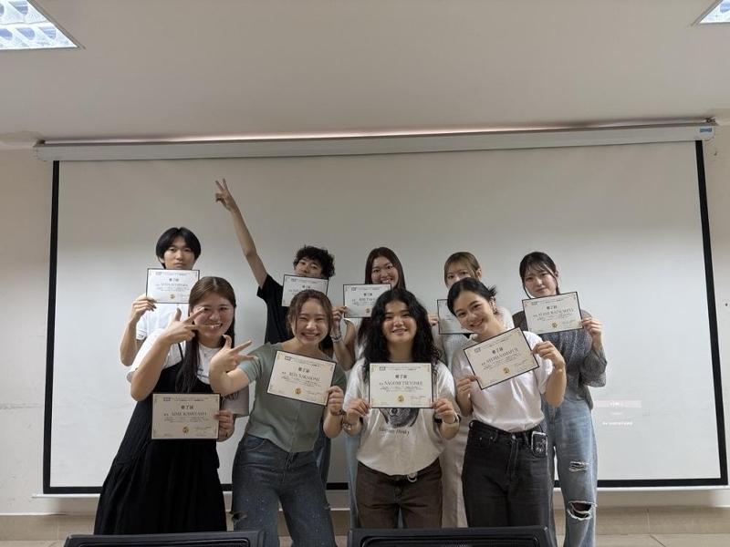 また、日本語学部の先生からホーチミンの学生とのフィールドワーク終了証を授与していただき、みんなで写真を撮りました。
